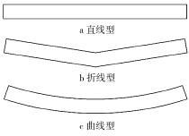 影響垂直螺旋輸送機(jī)性能的操作變量有螺旋轉(zhuǎn) 速、進(jìn)口速度、填充系數(shù)、螺旋葉片的形狀、顆粒的形狀等。試驗(yàn)選取進(jìn)口速度為 10 m/s,由文獻(xiàn)[5]可知,填充系數(shù)對(duì)平均顆粒速度、平均顆粒軸向速度、平均顆粒周向速度的影響很小,而本文中主要分析近軸處的 平均顆粒周向速度、近壁處的平均顆粒軸向速度,因 此可選填充系數(shù)取做一個(gè)固定參數(shù),即填充系數(shù)為 50%,忽略顆粒形狀對(duì)輸送性能的影響,因此試驗(yàn)選 取了螺旋轉(zhuǎn)速、螺旋葉片作為操作參數(shù),來展開詳細(xì) 的試驗(yàn)設(shè)計(jì)。 根據(jù)文獻(xiàn)[5]的分析,選取螺旋轉(zhuǎn)速參數(shù)分別為600、900、1 000、1 200、1 400、1 600、1 800 r/min;螺旋 葉片母線的形狀分別為直線型、折線型、曲線型,其形 狀簡(jiǎn)圖如圖 2 所示,由排列組合知識(shí)可知,需要進(jìn)行21 次試驗(yàn)。