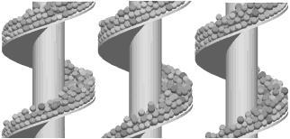 螺旋垂直提升機(jī)是螺旋輸送機(jī)中常見的一種。傳統(tǒng)的設(shè)計(jì)方法主要依靠經(jīng)驗(yàn)公式設(shè)計(jì),導(dǎo)致很難對(duì)螺旋輸送機(jī)的性能有很大程度地提升,而其在制藥、港口、農(nóng)業(yè)、水泥、食品等行業(yè)應(yīng)用廣泛,因此有必要對(duì)螺旋輸送機(jī)的設(shè)計(jì)與制造方法進(jìn)行研究。隨著計(jì)算機(jī)仿真技術(shù)的發(fā)展,越來越多的試驗(yàn)應(yīng)用于虛擬樣機(jī)的模擬中,這種處理不僅可以減少成本,提高效率,而且 能夠使設(shè)計(jì)者從產(chǎn)品的作用機(jī)理入手,解決在實(shí)際的 試驗(yàn)中很難觀察物料輸送中細(xì)觀甚至微觀特征[1-2]。螺 旋輸送機(jī)性能的模擬研究,早是由 Shimizu 等[3]發(fā)表 離散元法對(duì)螺旋輸送機(jī)中顆粒流的研究,并將研究結(jié) 果與先前的經(jīng)驗(yàn)方程進(jìn)行了對(duì)比分析。Cleary[4]研究了 顆粒形狀對(duì)喂料口進(jìn)入的物料下降形式和輸送機(jī)的輸送特性的影響。Owen 等[5] 詳細(xì)研究了操作條件,如 填充率、傾角和螺旋轉(zhuǎn)速等對(duì)螺旋輸送機(jī)性能的影 響,但其未對(duì)螺旋葉片的形狀進(jìn)行詳細(xì)討論。而這一課題在國(guó)內(nèi)尚未有詳細(xì)的研究。本文中將對(duì)螺旋葉片進(jìn)行研究,并結(jié)合其他操作條件,預(yù)測(cè)螺旋輸送機(jī)的性能。