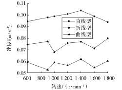 通過離散元模擬,得出了在不同轉(zhuǎn)速下的 3 種不同螺旋葉片形狀對(duì)平均顆粒速度的變化趨勢(shì),如圖4所示,對(duì)于直線型母線螺旋葉片,顆粒的輸送速度從所示,對(duì)于直線型母線螺旋葉片,顆粒的輸送速度從保持線性減小,整體的輸送速度變化幅度為 0.01 m/s, 輸送平穩(wěn),且1400 r/min 輸送速度大。對(duì)于折線型 母線螺旋葉片,顆粒輸送速度在 1 000、1 600 r/min ,為 0.07 m/s,在 1 800 r/min 有增大趨勢(shì),因此,從趨 勢(shì)中不能很好地得出螺旋轉(zhuǎn)速與平均顆粒速度之間的 關(guān)系。對(duì)于曲線型母線螺旋葉片,顆粒輸送變化范圍 小,輸送為平穩(wěn)。在 600~1 800 r/min 范圍內(nèi),平均顆 粒速度保持在 0.055 m/s 左右,輸送效果。