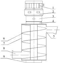 1.電動(dòng)機(jī),2.減速器,3.機(jī)座,4.上軸承座,5.出料口, 6.螺旋葉片,7.殼體,8.進(jìn)料口,9.下軸承座